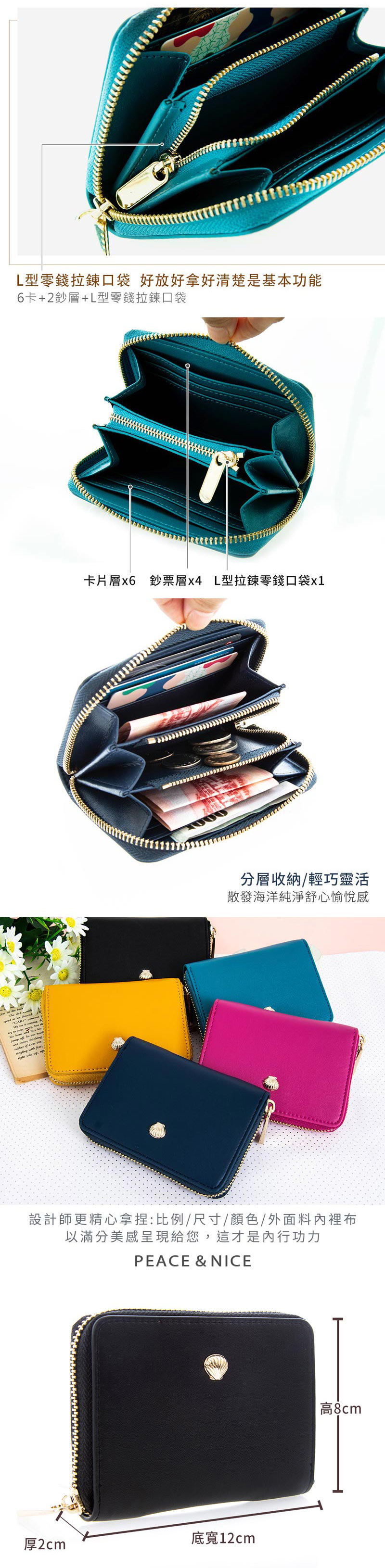 收納:鈔票層x2、卡片層x6、內L型拉鍊零錢層x1